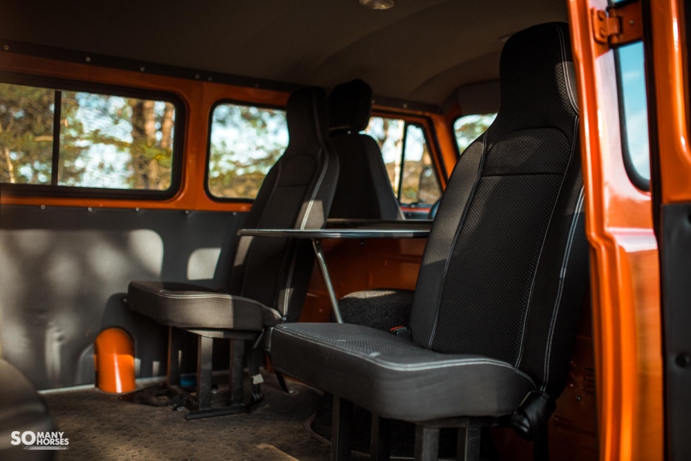 Также нельзя не отметить пассажирский отсек, где у нас есть целых 5 посадочных мест, из которых 2 оснащены трехточечными ремнями безопасности. А остальные 3 места, включая места у столика, — поясами. Места за столиком установлены против хода движения, и если пассажиры захотят перекусить или поработать за ноутбуком, то будут сидеть полубоком. Крепление столика достаточно прочное, поэтому нет необходимости останавливаться, чтобы поесть в длительной поездке. Это действительно удобно.