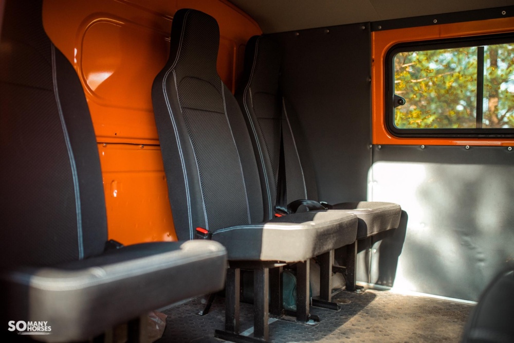 Уникальным решением с точки зрения компоновки является единственный в этой машине салонный плафон освещения, который расположен над столом и светит достаточно ярко, если тяга включения не достигает потолка. Это одна из особенностей пресс-парка. К слову, салон такого утилитарного автомобиля можно трансформировать, хотя зачем?