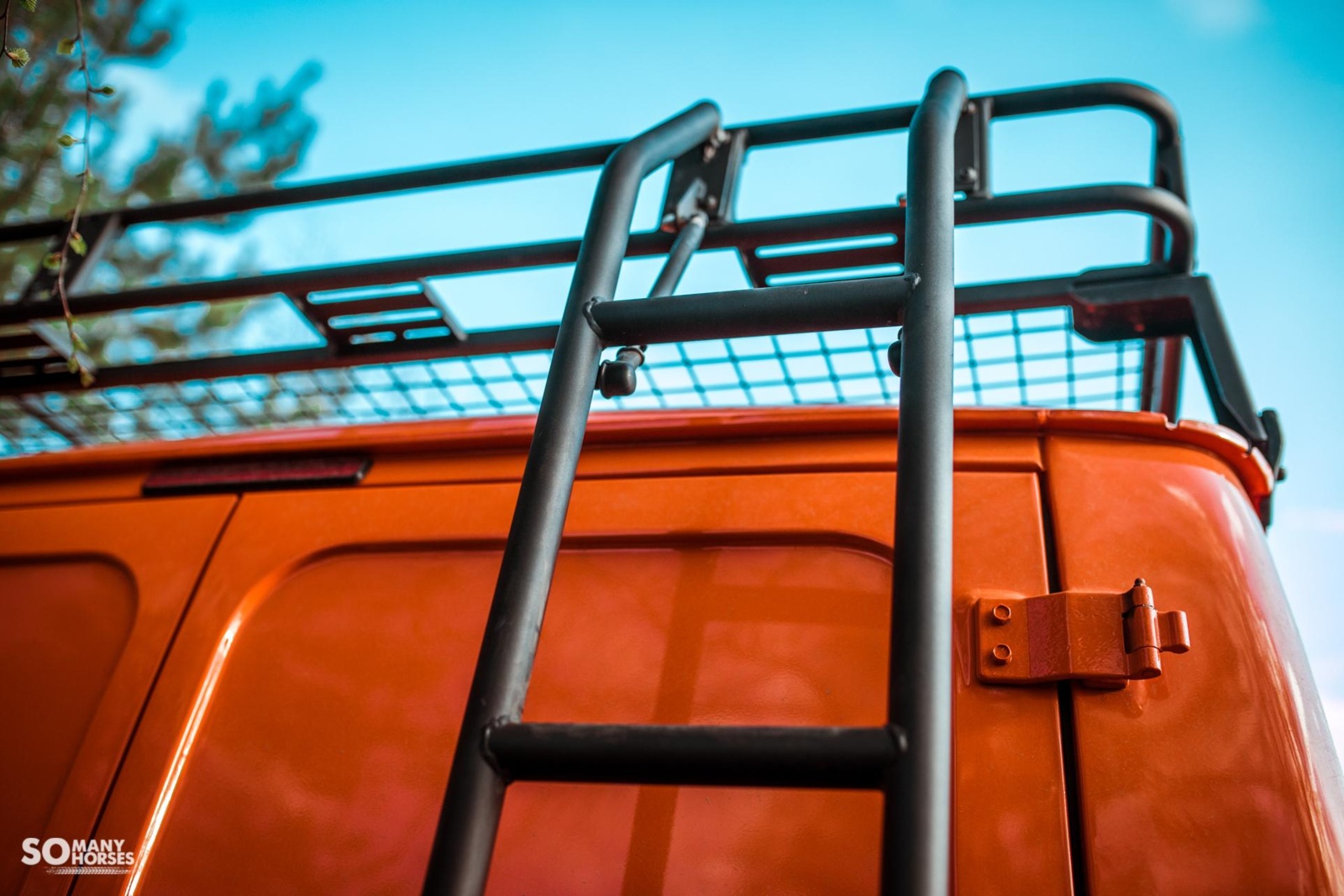 Задний бампер висит ниже, чем хотелось бы, но это из-за распашных дверей багажника. Лестница работает отлично, открывается без проблем. Однако не совсем понятно, как изменится проходимость после всех этих улучшений, но лично меня все устроило. Самый неудобный момент при эксплуатации этого автомобиля — это загрузка грузового отсека.