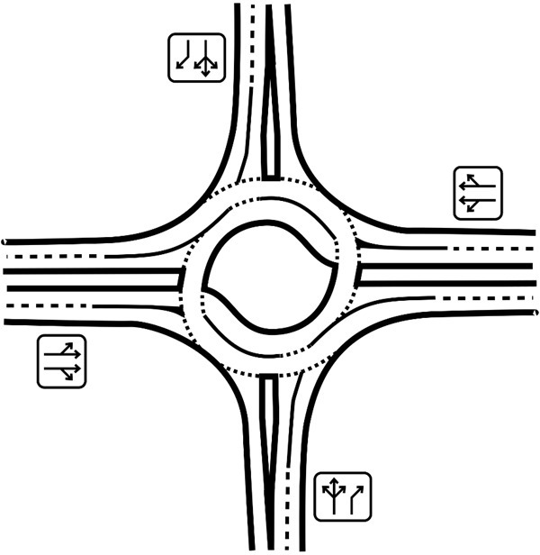 Общим для них является только то, что все траектории обходят центральный островок. В то же время водители заранее выбирают нужную полосу и больше не изменяют ее. Таким образом, количество полос может быть любым.